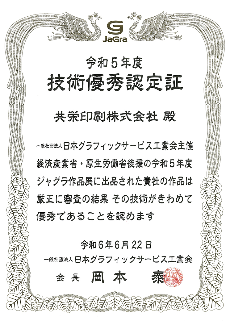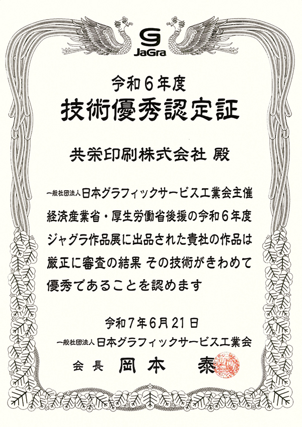 令和6年度ジャグラ作品展に当社で制作に携わった冊子「知育あそび・よくばり帳」を出品し、技術優秀認定証をいただきました。 | |