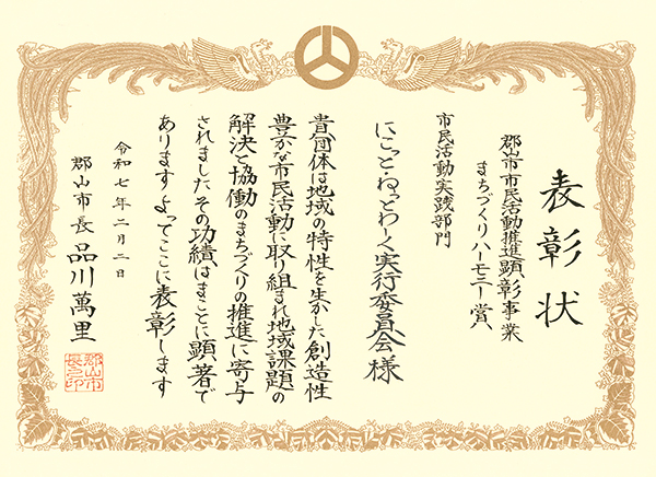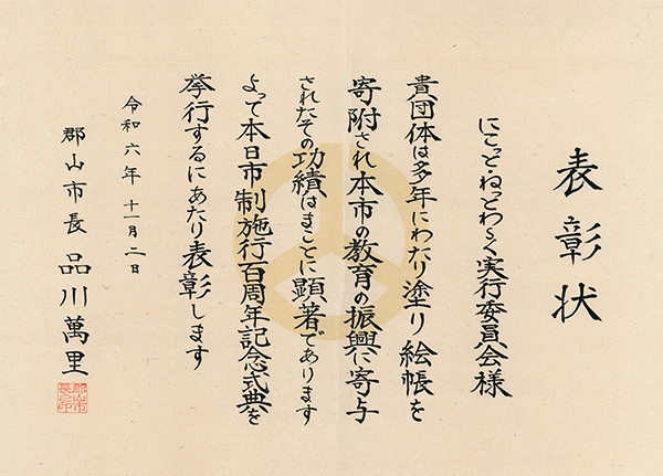 【郡山市から表彰されました】 まちづくりハーモニー賞(市民活動実践部門)と、市制施行100周年記念式典挙行にあたり市への寄付で表彰されました。実行委員会の1社として取り組んでいる、オリジナル知育冊子の寄贈活動について評価していただきました。 |