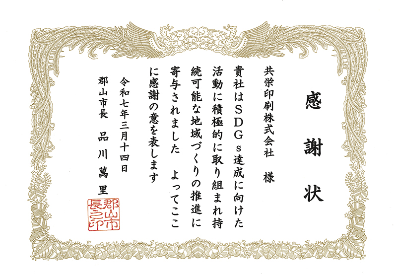 SDGs達成に向けての取り組みで、郡山市から感謝状をいただきました。 |