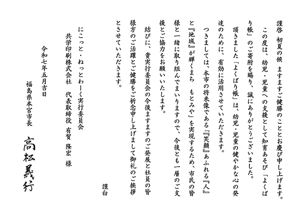 今年もオリジナル塗り絵冊子「よくばり帳」を本宮市に寄贈し、お礼状をいただきました。写真 |