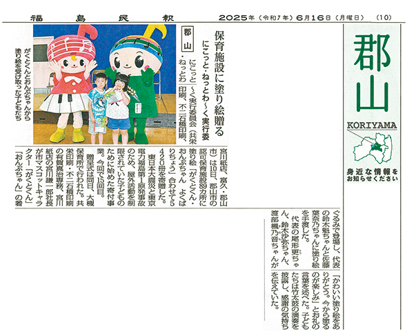 5月24日(木)に不二印刷様、富久様、宮川紙店様、共栄印刷の4社で、郡山市内の公立保育所・民間認可保育所計69施設に「がくとくん・おんぷちゃんよくばりちょう」4338冊を寄贈しました。 福島民友・福島民報掲載記事 |