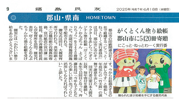 オリジナル塗り絵冊子「よくばり帳」を郡山市に寄贈し、福島民報新聞・福島民友新聞に掲載されました。 福島民報新聞/ 福島民友新聞 | |