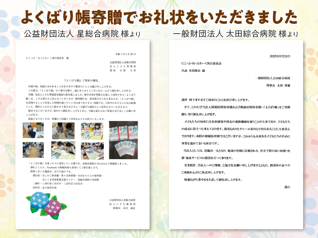 オリジナル塗り絵冊子「よくばり帳」を寄贈した星総合病院様・太田綜合病院様よりお礼状をいただきました。 | |